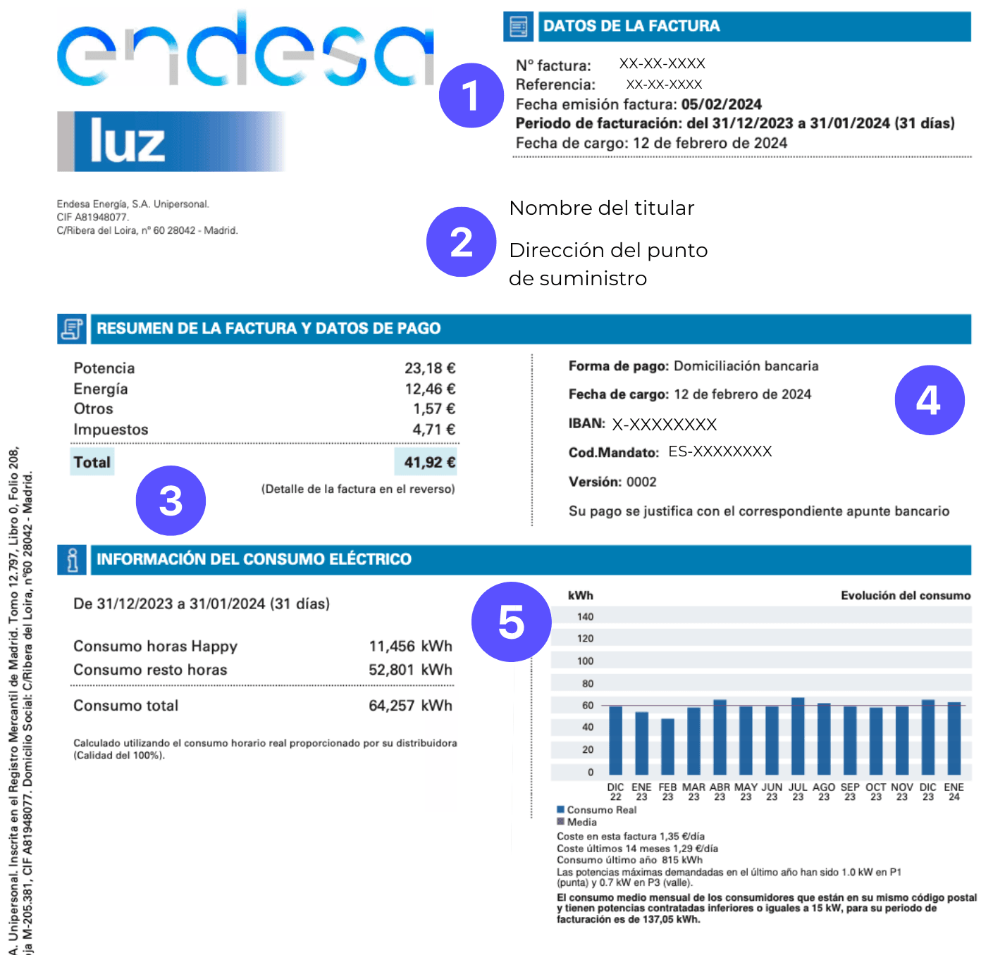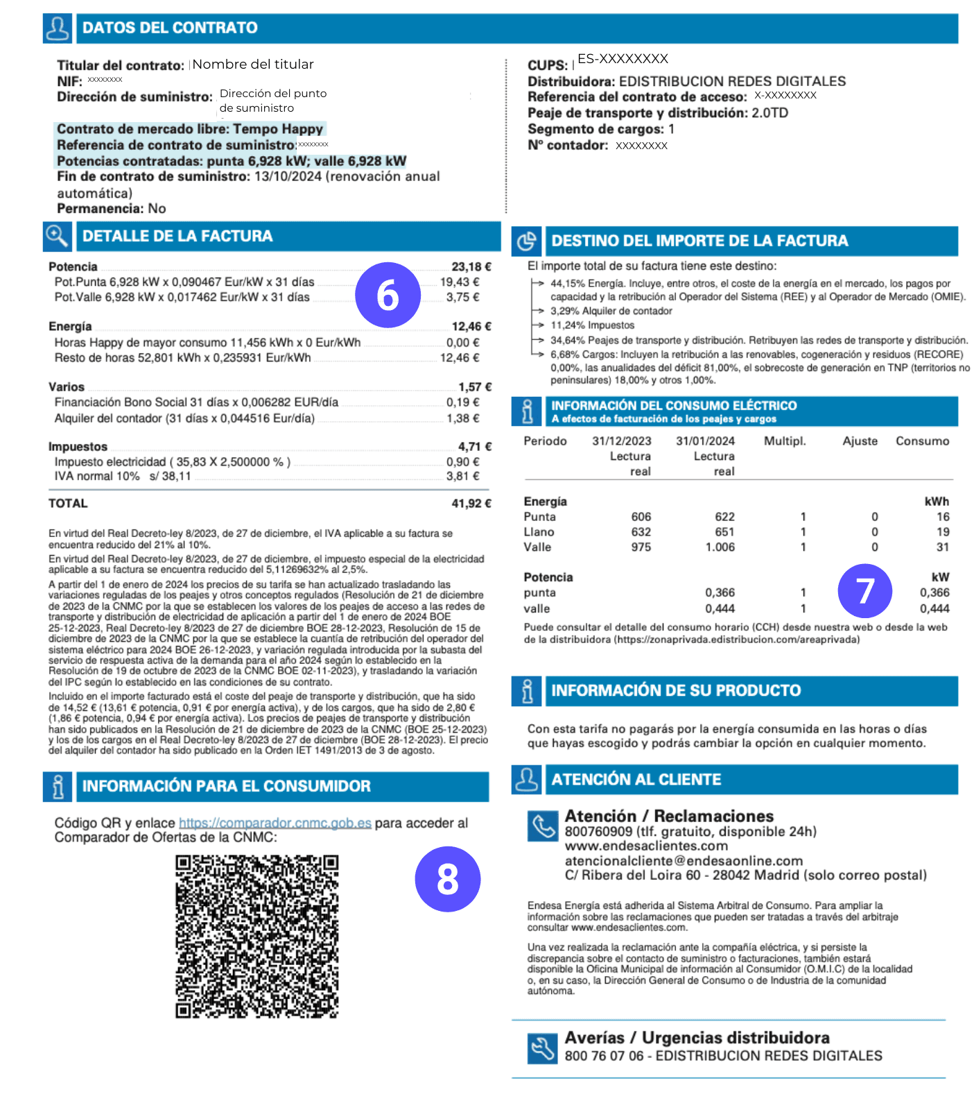 La suma de todos los conceptos constituye el importe total de la factura. Es recomendable revisar este valor y comprobar si se puede ahorrar ajustando la potencia o cambiando de tarifa.